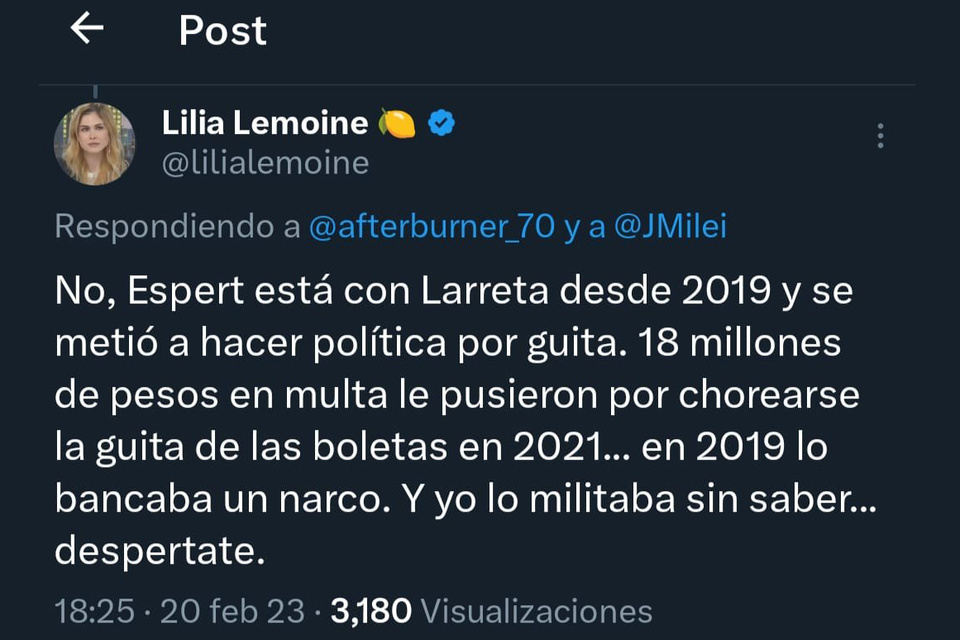 Pero una de las más enfáticas en denunciar a Espert fue desde siempre la diputada Lilia Lemoine. Allá por febrero de 2023, es decir mucho antes de cualquier alianza entre LLA y el PRO, la entonces cosplayer había dado cuenta de que “en 2019 (a Espert) lo bancaba un narco”.